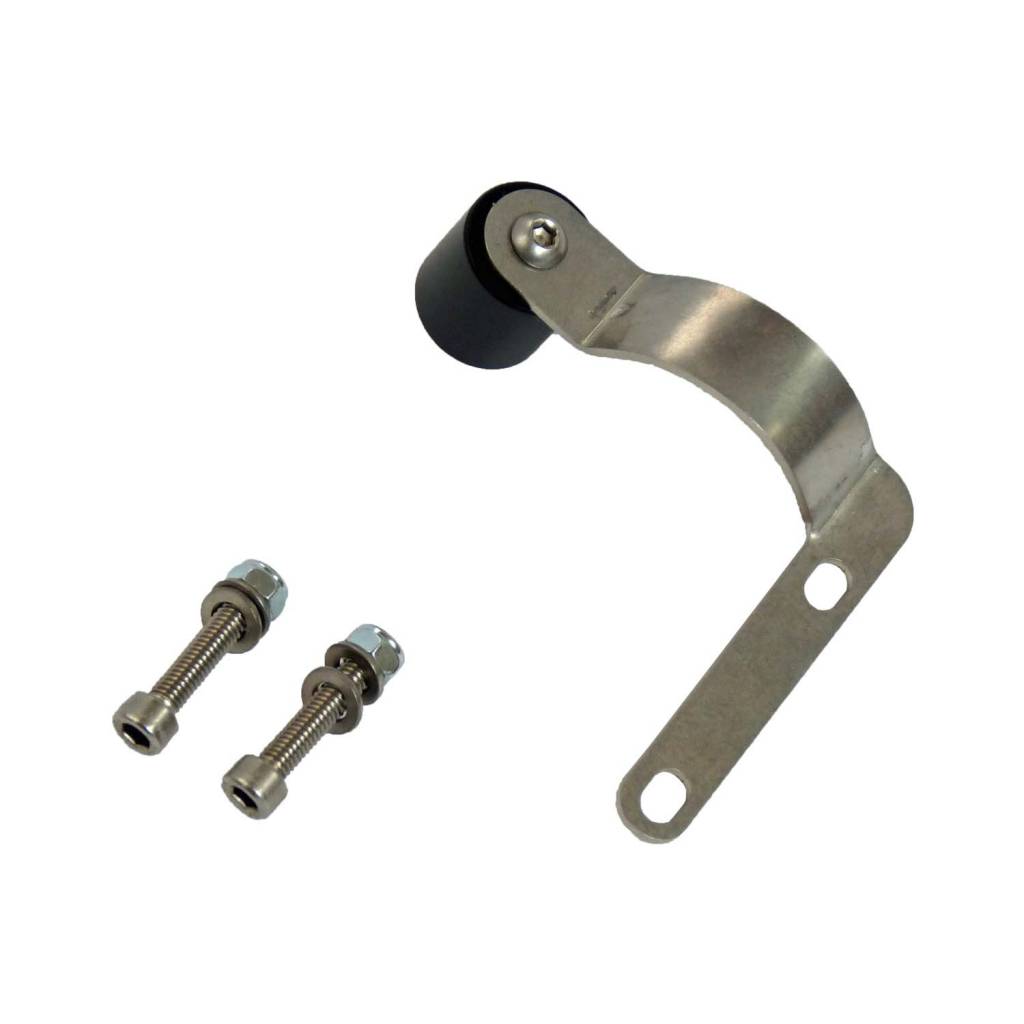 Die komt vooraan, net achter de trapboom. De steun lijkt erg mooi gemaakt: roestvast staal, bevestigd waar de trapboom in de buis geklemd wordt. Maar anderzijds: 20 euro voor een klein stukje gebogen metaal is niet min.